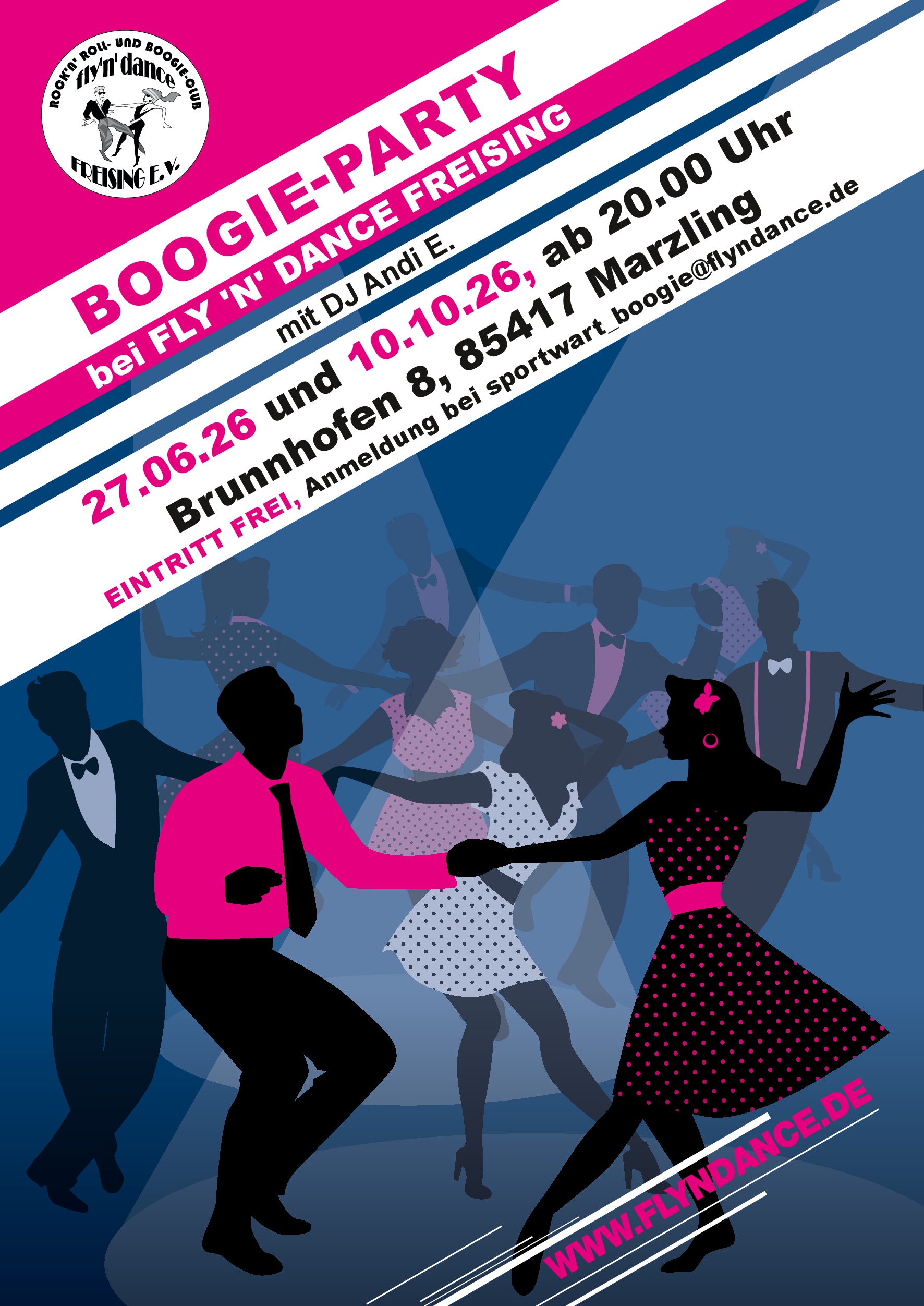 Wir veranstalten auch dieses Jahr wieder Boogie-Tanzpartys in unserem Vereinsheim in Brunnhofen! DJ Andi E sorgt ab 20 Uhr für gute Klänge und treibt auf die Tanzfläche. Der Eintritt ist frei. Zur besseren Planung bitten wir um Voranmeldung unter sportwart_boogie(at)flyndance.de