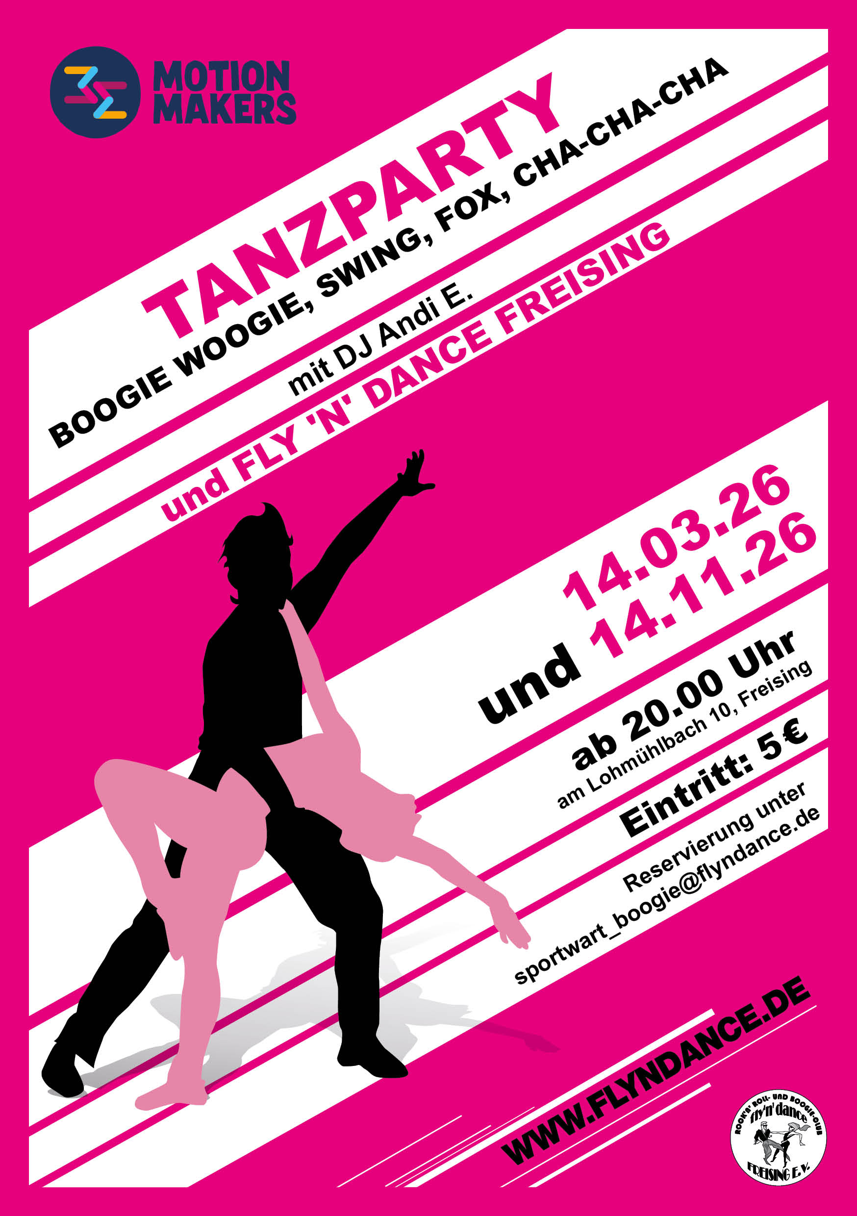 Am 14. März und 14. November laden wir zum Tanz in den Räumen der Motion Makers! Der Eintritt beträgt 5€. Reservierungen für Gruppen an sportwart_boogie(at)flyndance.de